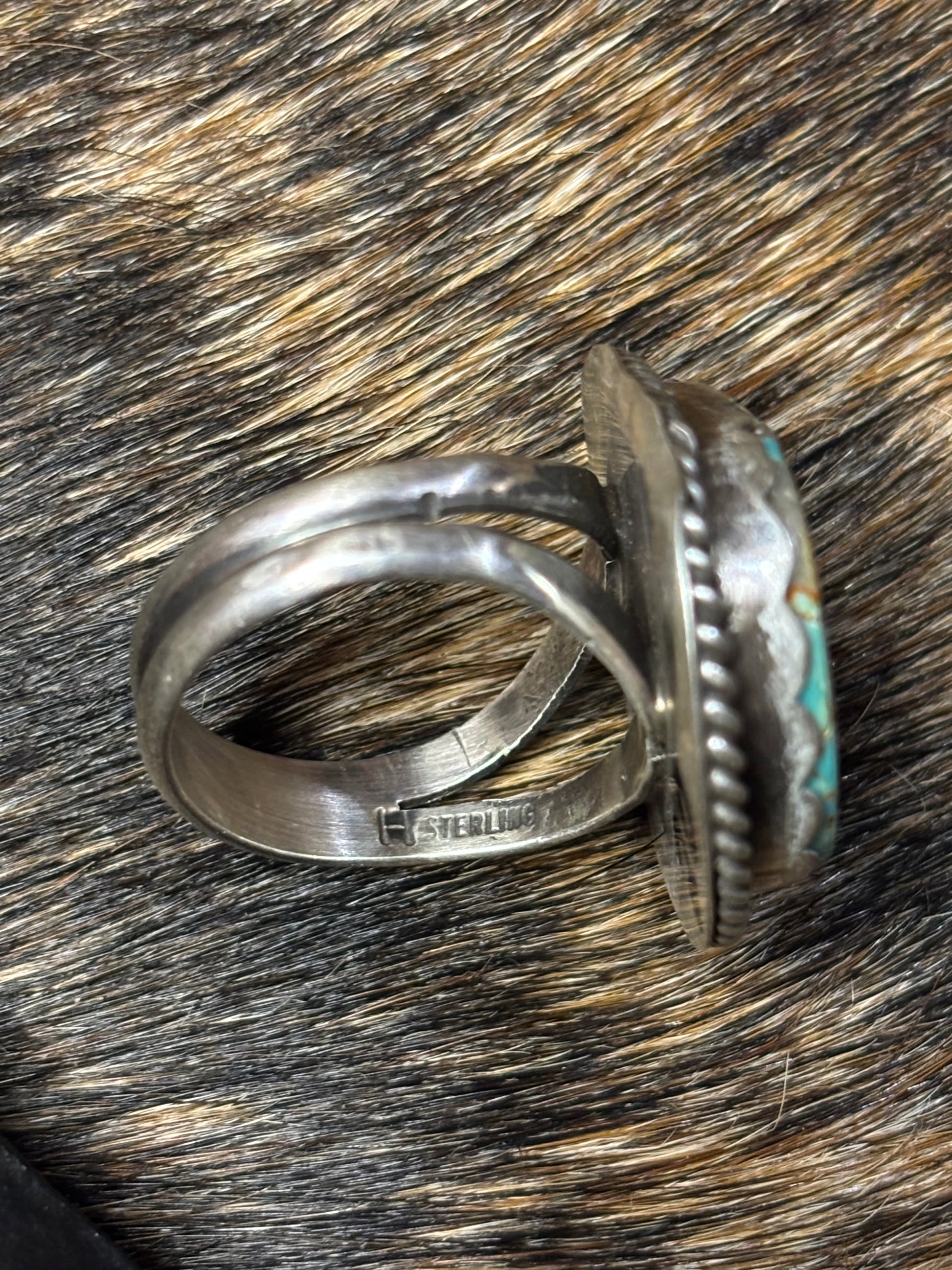 This is a handmade Native American Navajo Artist crafted by Vicky Hicks. The ring features a beautiful Royston turquoise stone with a beautiful sterling silver bezel setting style, it adds a unique touch and artistic design to the ring!
