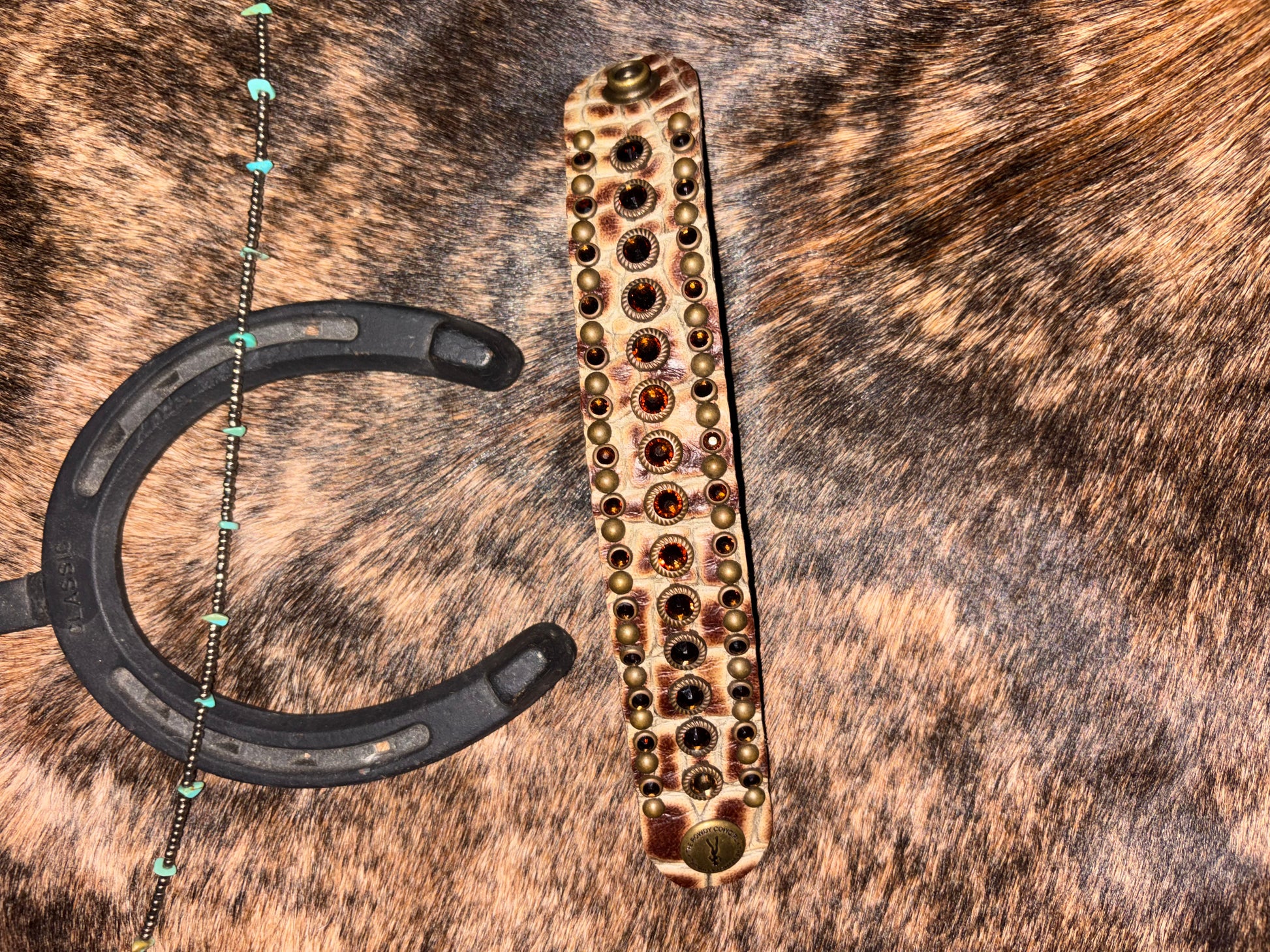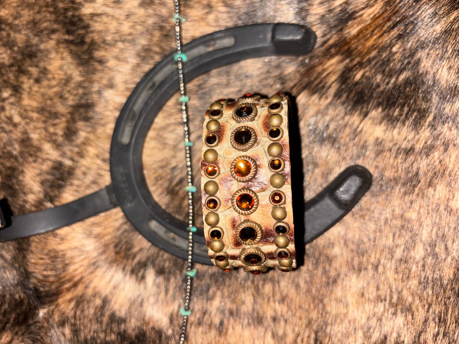 A Swarovski cuff bracelet, with crocodile skin leather.